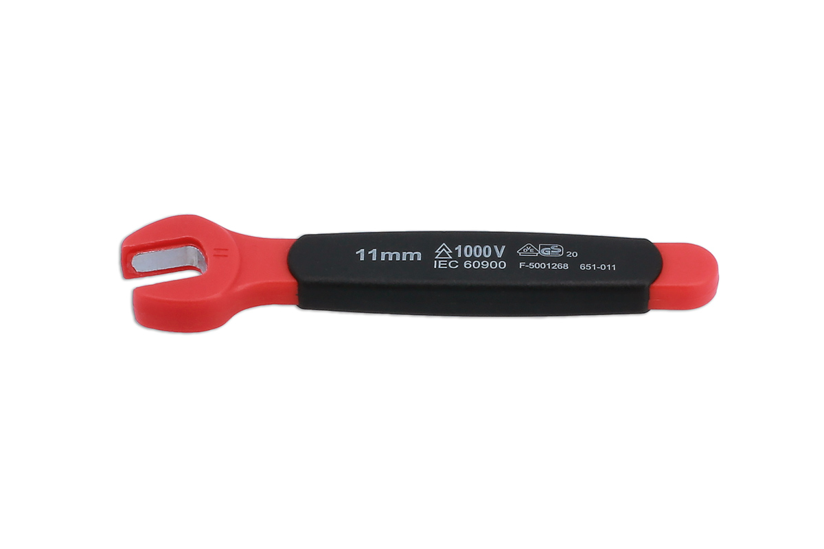 A fully insulated 11mm open end spanner for use on modern hybrid and electric vehicles, suitable for live working up to 1000V AC/ 1500V DC. Both GS and VDE certificated, and manufactured according to the IEC60900 standard for safe use in a high voltage environment.