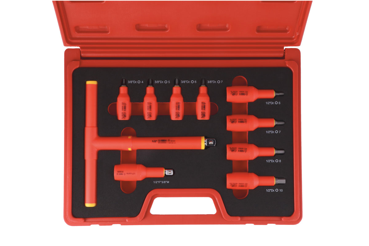 Vollständig isolierter Satz Sechskantbit-Steckschlüssel, komplett mit Schraubendreher mit T-Griffstück und Adapter, für den Einsatz in modernen Hybrid- und Elektrofahrzeugen. Zertifiziert nach IEC60900 für Arbeiten unter Spannung bis 1000 VAC/1500 VDC, Größen von H4 bis H10, ideal für den Einsatz durch Elektriker und Autoelektriker. Die Größen sind zur einfachen Identifizierung deutlich an der Seite gekennzeichnet; die Schraubenschlüssel werden zur sicheren Aufbewahrung in einem robusten Tragekoffer geliefert.