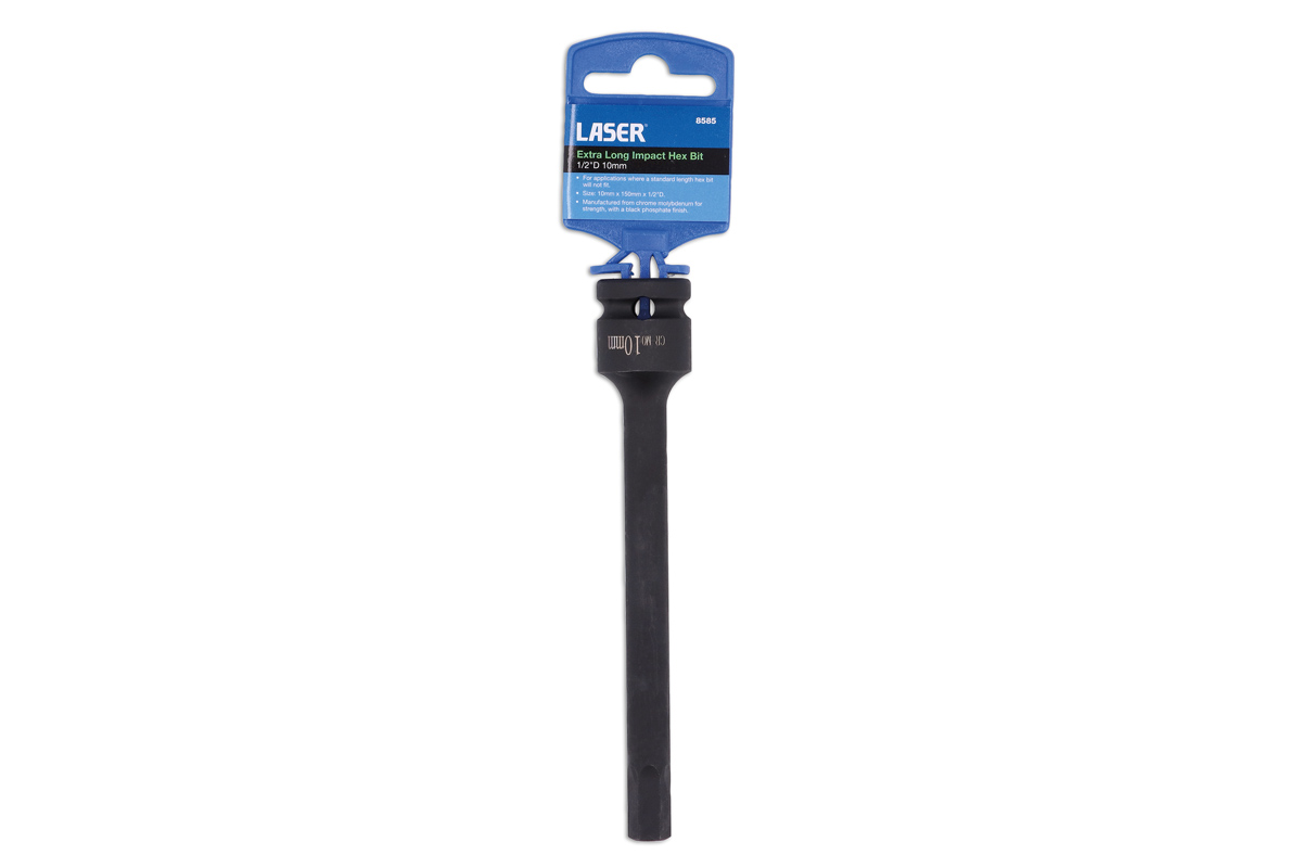 A 150mm long 1/2"D impact quality 10mm hex bit socket, suitable for use on hard to reach or recessed fixings. Featuring a one piece construction and manufactured from chrome molybdenum for impact strength with anti-corrosion black phosphate finish, together with a groove and holes for use with a retaining ring and pin.