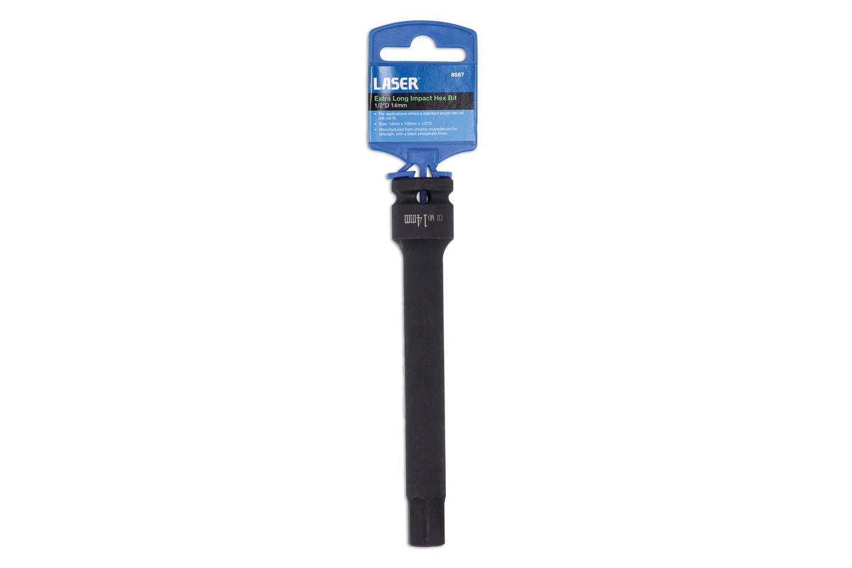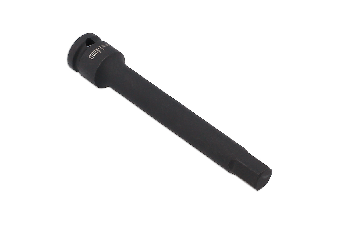 A 150mm long 1/2"D impact quality 14mm hex bit socket, suitable for use on hard to reach or recessed fixings. Featuring a one piece construction and manufactured from chrome molybdenum for impact strength with anti-corrosion black phosphate finish, together with a groove and holes for use with a retaining ring and pin.