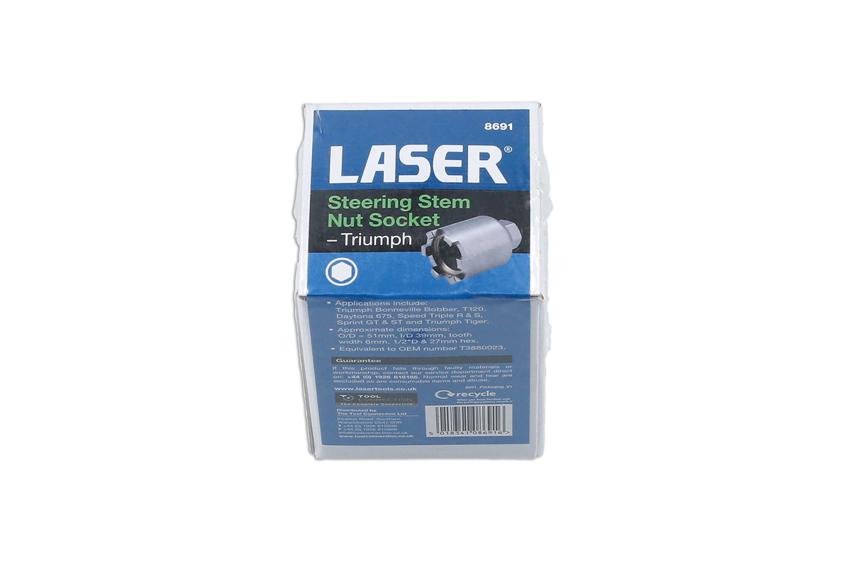 New to the Laser Tools’ specialist motor-cycle tool range is this Steering Stem Nut Socket (part number 8691), designed for Triumph models. The steering stem nut is located beneath the top yoke, and this 6-tooth castellated socket is specifically designed to facilitate the accurate loosening, tightening, and torquing of the steering head bearing before installing the top yoke.