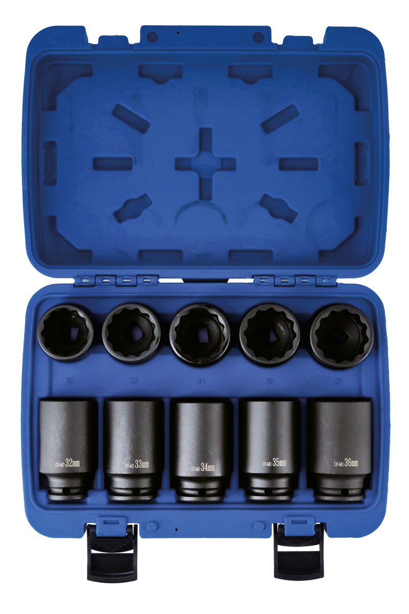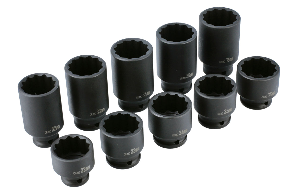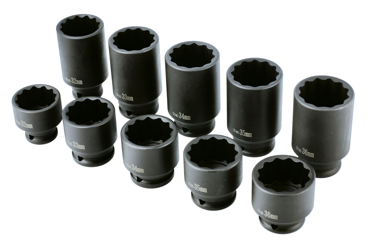 An impact socket set in 1/2" square drive, Bi-Hex (12pt) profile. This ten piece box set covers a range of commonly used larger sizes, from 32mm to 36mm, in 2 different depths, and ideal for use on hub nuts. Manufactured from chrome molybdenum, designed to withstand the stresses of impact tool use. They also feature a practical black phosphate finish, offering improved corrosion resistance, together with a drilled collar to accept retaining pin or detent ball.