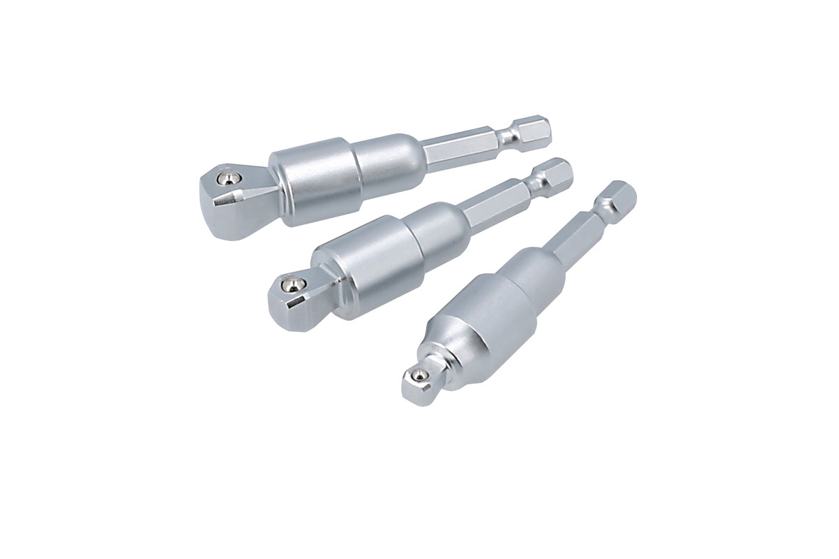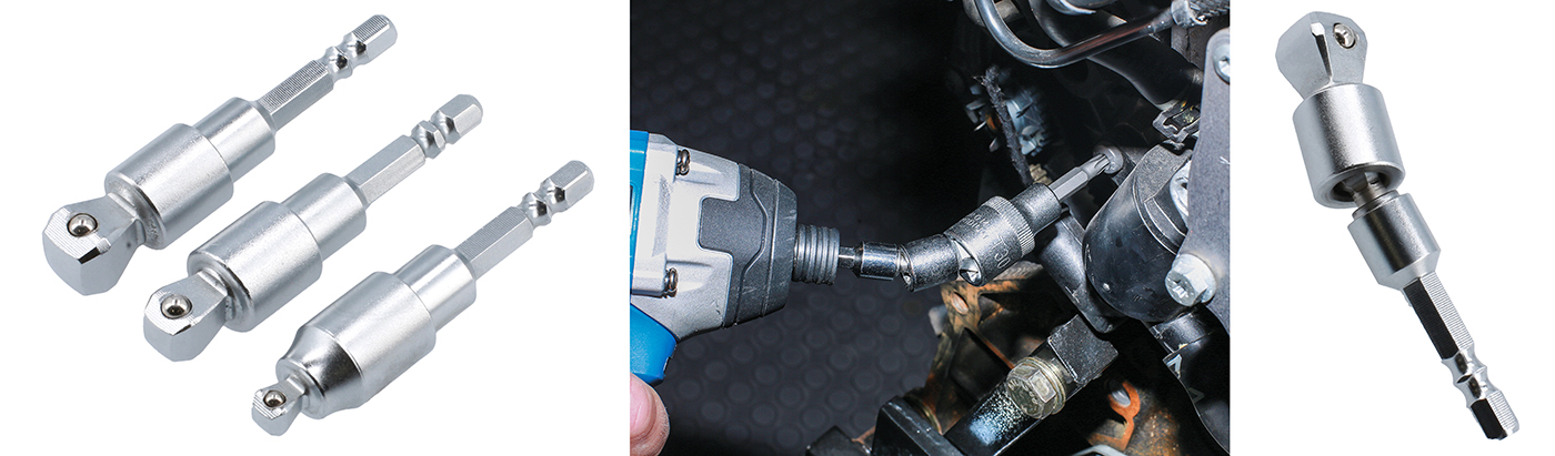 - Satz aus drei Steckschlüsseladaptern mit Taumelfunktion für umlenkbaren Einsatz.