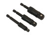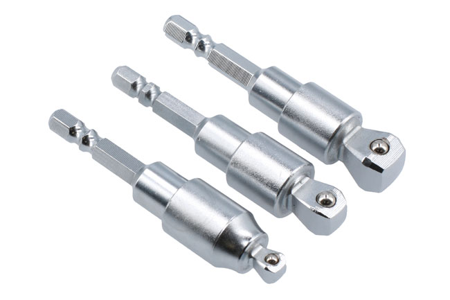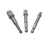 A three piece ‘off-line’ ball end socket adaptor set in 1/4"D, 3/8"D and 1/2"D sizes. Designed with a 1/4" hex shank for quick release chucks, these adaptors allow the use of sockets in areas where access is limited or difficult, as they have a ball-end allowing 10 deg of movement and a further 40 deg range from the design of the tool. The integral magnet gives a self-locking and self-centring function. Overall length approx. 75mm. Not designed for impact tool use.