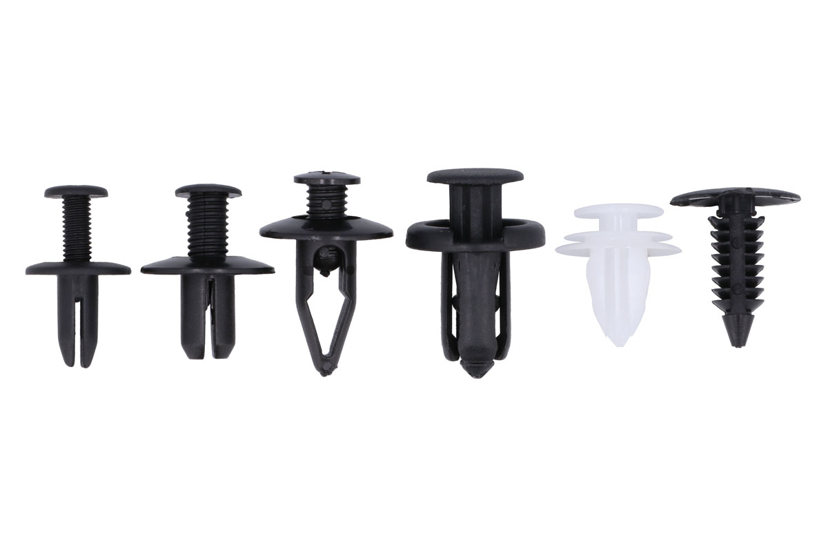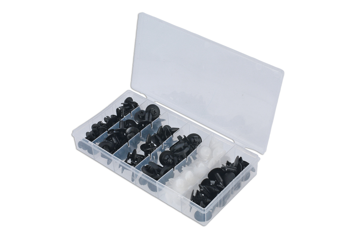 - An assorted box of popular sized plastic trim clips, including; 20x fir tree fixings, 20x panel clips, 10x push rivets & 50x screw rivets. Top-up kits available.