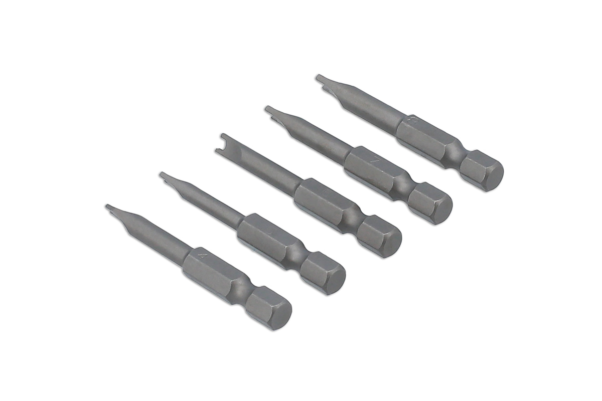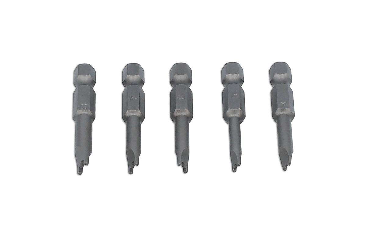 A set of 5 security bits designed for use on U-type, snake eye, 2-hole, or spanner type tamper proof screw heads. Manufactured from S2 silicon steel, with a magnetised tip, these 1/4" shank bits and magnetic holder are ideal for use with cordless screwdrivers fitted with a quick chuck, cordless drills and bit drivers.
