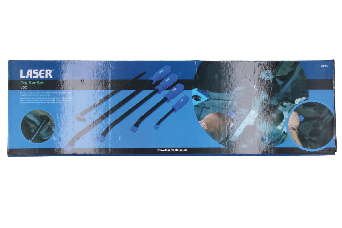 A set of 5 pry bars, containing 4 heavy duty pry bars with plastic comfort grip handles and supplied with protective caps for tips. The set also includes a double-ended fine point toe and sharp profile heel pry bar suitable for aligning holes prior to fitting fixings etc, together with removing hubcaps and plastic covers. Supplied in an EVA foam tray, designed to fit roll cab drawers.
