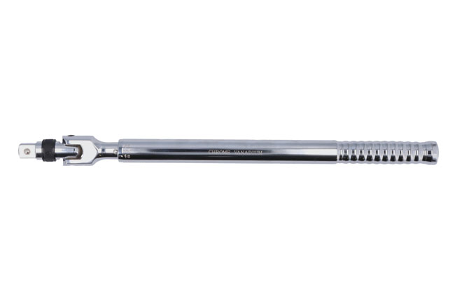 A telescopic 3/4"D power bar with a flexible head and socket safety lock, allowing for a greater torque to be applied when loosening stubborn or corroded fixings. The stepless adjustable handle mechanism allows it to extend from 500mm to 800mm, with the safety lock holding the socket in place and preventing it from detaching from the head and causing damage or injury.