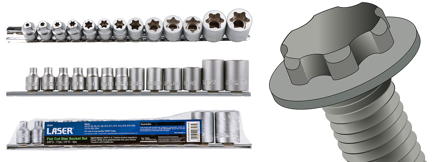 - Flat-cut sockets for use on low-profile TORX® bolts. Applications include BMW 5 & 7 Series window regulators, Nissan QR25 drive plate/flywheel bolt, plus various Toyota & JLR models etc.