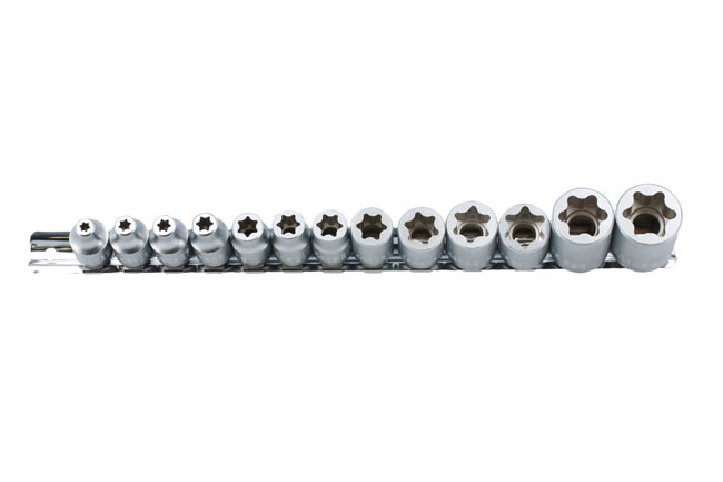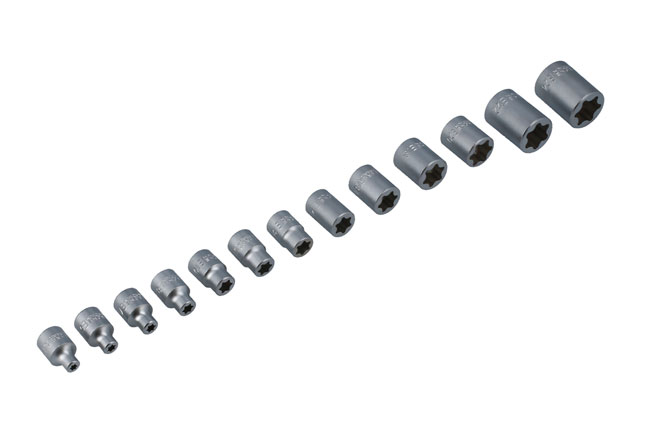 A set of 3/8"D flat-cut star sockets, from E5 to E20, manufactured from satin finish chrome vanadium. Designed to fit low-profile TORX head bolts where the normal socket profile would not give full contact with the fixing. As found on modern vehicles including BMW 5 and 7 Series, Nissan, Toyota and JLR models. Often used for body panel fixing etc. Supplied on a socket rail for easy storage.