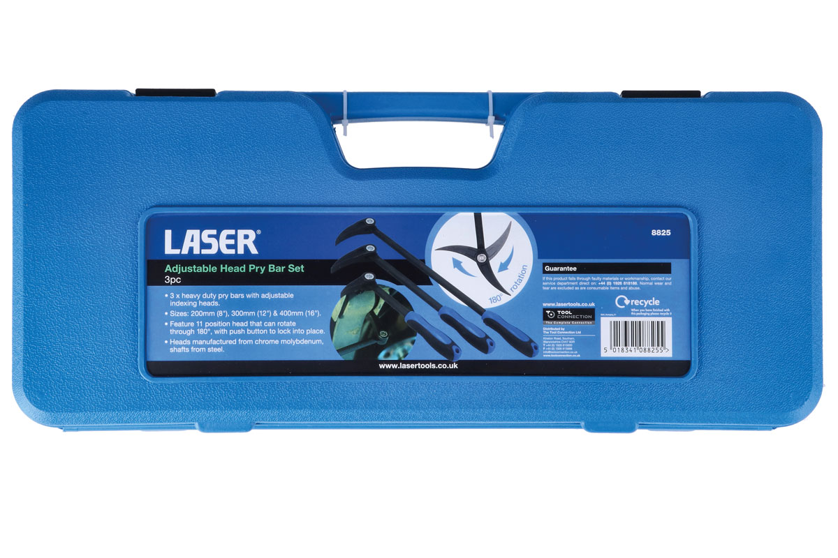A set of 3 adjustable head pry bars, manufactured from chrome molybdenum and steel, with sort grip handles for comfort. The heads are indexed, giving 11 set positions through 180 degrees, which can be locked into place by use of a push button on the side of the head. Can be used in a wider variety of positions than a traditional fixed head pry bar and ideal for use in hard to access areas.