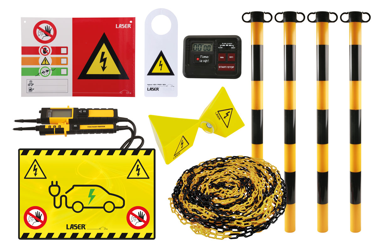 A set of standard safety equipment for workshops preparing to service EV’s and PHEV’s, consisting of all of the necessary items required when preparing to service a BEV or PHEV High Voltage Vehicle. Ensures that safety protocols are in place, and that basic safety checks can be carried out on the vehicle before service work commences. NOTE: Shut-down timer and voltage tester should be used in accordance with vehicle manufacturers shut-down procedures for the vehicle in question.