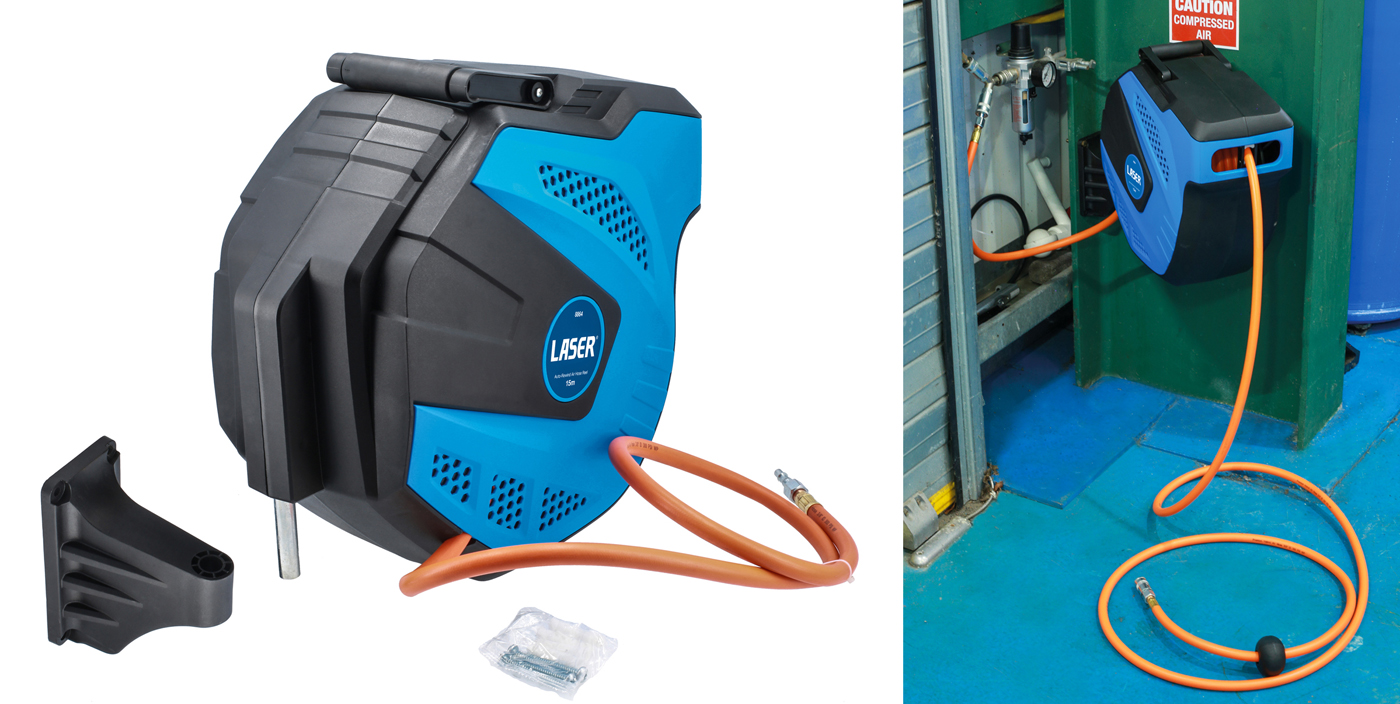 A retractable 15m workshop airline hose, with 3/8” (10mm) internal diameter and fitted with 1/4" BSP couplings, in a wall mounted housing. It features an auto-stop function, allowing for the hose to be extended and stopped at any length, together with an auto-retract function which guides the hose smoothly and neatly back into the housing. The high-visibility hose has a PVC/rubber construction and is silicone free, making it ideal for use in a bodyshop.