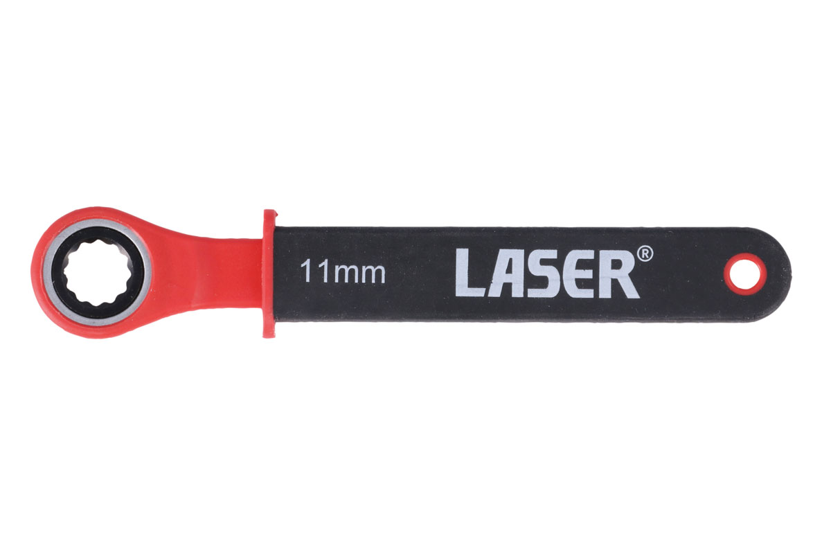 A fully insulated 11mm Bi-Hex (12pt) ratchet ring spanner for working on hybrid and electric vehicles, suitable for live working up to 1000V AC/ 1500V DC. Both GS and VDE certificated, and manufactured according to the IEC60900 standard for safe use in a high voltage environment. Suitable for use by technicians and mechanics, professional electricians and installers.