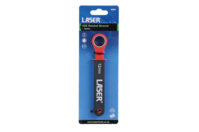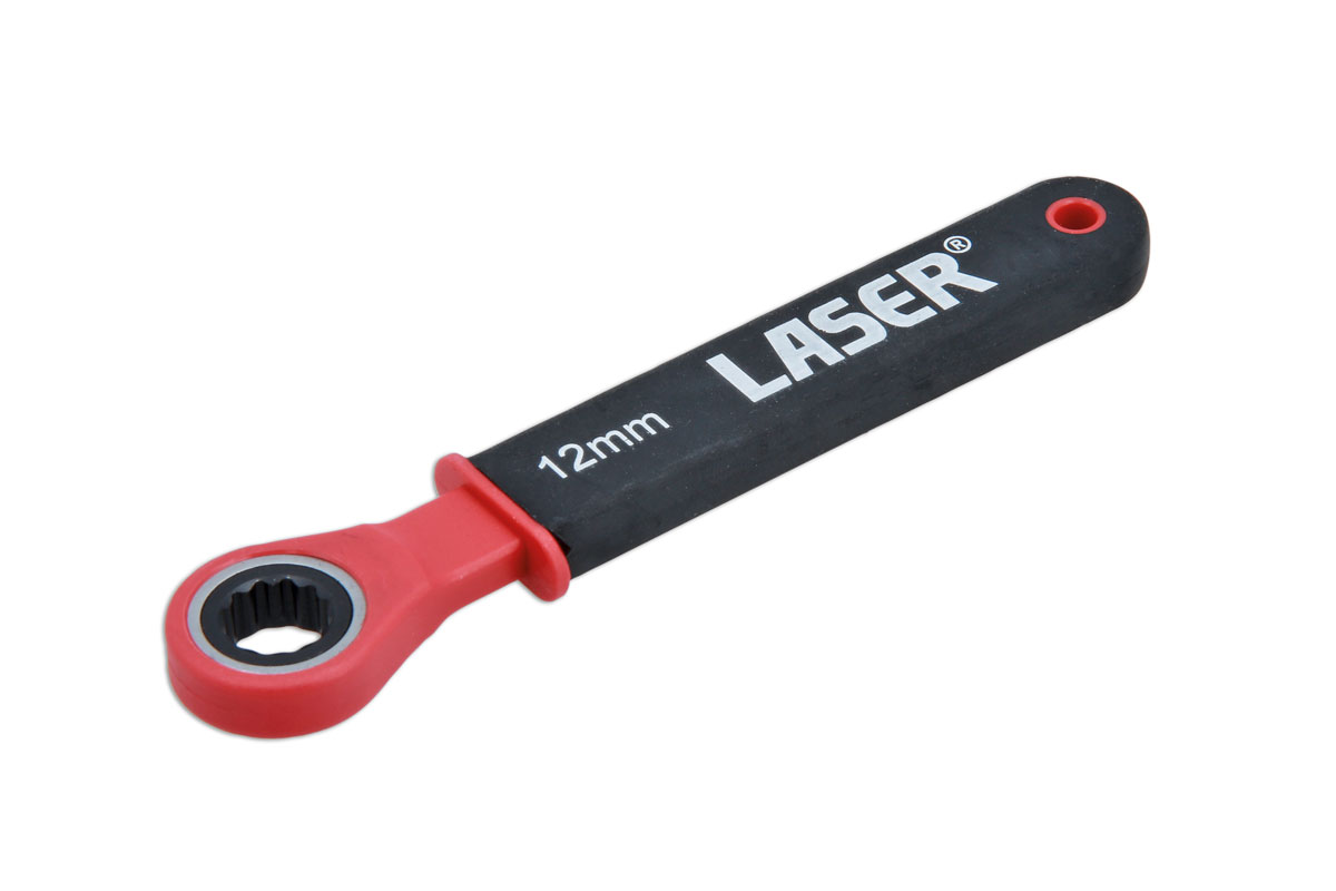 A fully insulated 12mm Bi-Hex (12pt) ratchet ring spanner for working on hybrid and electric vehicles, suitable for live working up to 1000V AC/ 1500V DC. Both GS and VDE certificated, and manufactured according to the IEC60900 standard for safe use in a high voltage environment. Suitable for use by technicians and mechanics, professional electricians and installers.