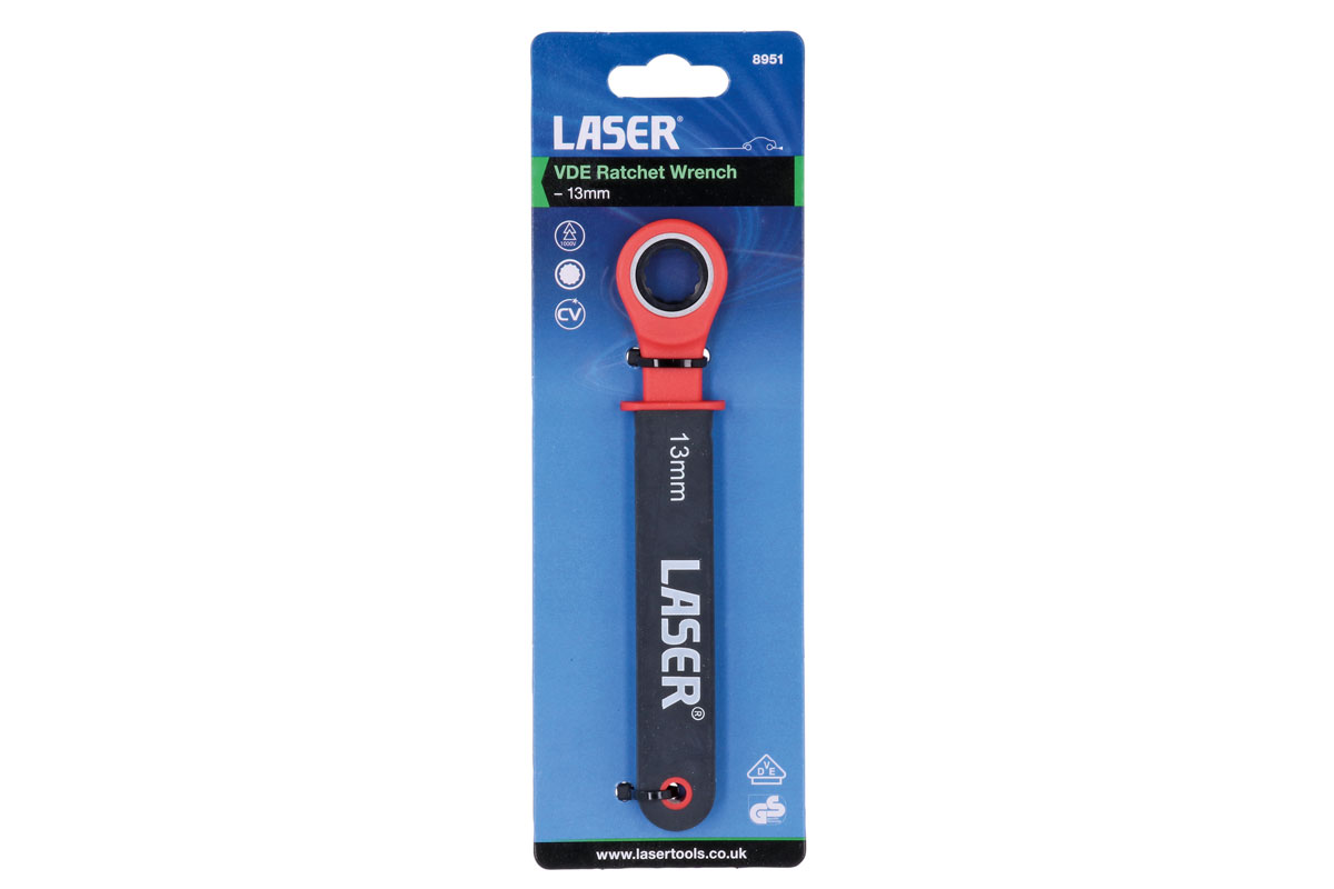A fully insulated 13mm Bi-Hex (12pt) ratchet ring spanner for working on hybrid and electric vehicles, suitable for live working up to 1000V AC/ 1500V DC. Both GS and VDE certificated, and manufactured according to the IEC60900 standard for safe use in a high voltage environment. Suitable for use by technicians and mechanics, professional electricians and installers.