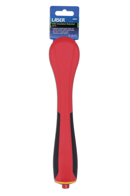 A fully insulated 3/8"D ratchet with a reversible 72 tooth mechanism, VDE and GS certified for safe operator use on live circuits up to 1000V AC and 1500V DC. It features a ratchet direction switch on the base of the handle, together with a ratchet locking mechanism and socket release button, to help keep the users hand away from the working end of the wrench. It also features a curved ergonomic handle, with a thermoplastic rubber non-slip grip. Suitable for use by technicians and mechanics working on hybrid and electric vehicles, together with professional electricians and installers.