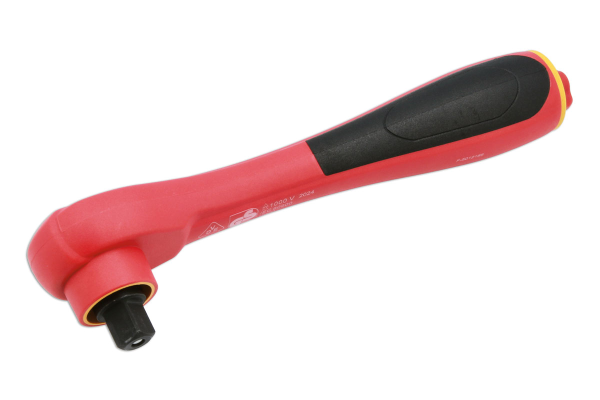 A fully insulated 1/2"D ratchet with a reversible 72 tooth mechanism, VDE and GS certified for safe operator use on live circuits up to 1000v AC and 1500v DC. It features a ratchet direction switch on the base of the handle, together with a ratchet locking mechanism and socket release button, to help keep the users hand away from the working end of the wrench. It also features a curved ergonomic handle, with a thermoplastic rubber non-slip grip. Suitable for use by technicians and mechanics working on hybrid and electric vehicles, together with professional electricians and installers.