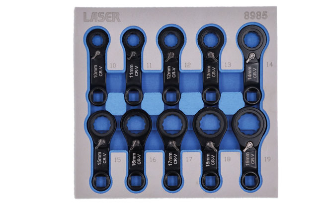 A ten piece set of torque extension adaptors (crow's foot ring spanners) with a Bi-Hex (12pt) profile from sizes 10mm up to 19mm, each featuring a reversible 120 teeth ratchet mechanism, to enable the use of a 3/8"D torque wrench in tight or restricted access applications. Please note: torque settings must be recalculated to take into account the extra length of these extenders. Supplied in an EVA foam tray, designed to fit roll cab drawers, keeping the adaptors clean, tidy and ready for use.