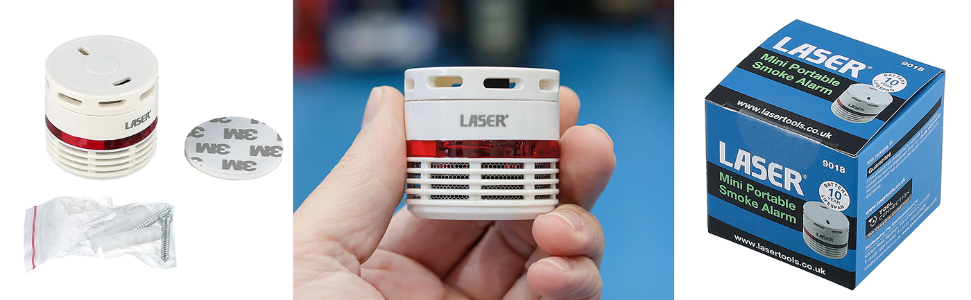 This new miniature portable smoke alarm from Laser Tools (part number 9018) is designed for use across a range of environments, including workshops, garages, homes, and garden sheds. With the increasing adoption of electric vehicles and power walls, installing a smoke detector in your garage or workspace is highly recommended. Compact and discreet, this smoke alarm can be easily mounted on ceilings, walls, workbenches, or tool cabinets, providing essential fire safety. Its small size makes it also ideal for narrowboats, cabin cruisers, caravans and motorhomes.