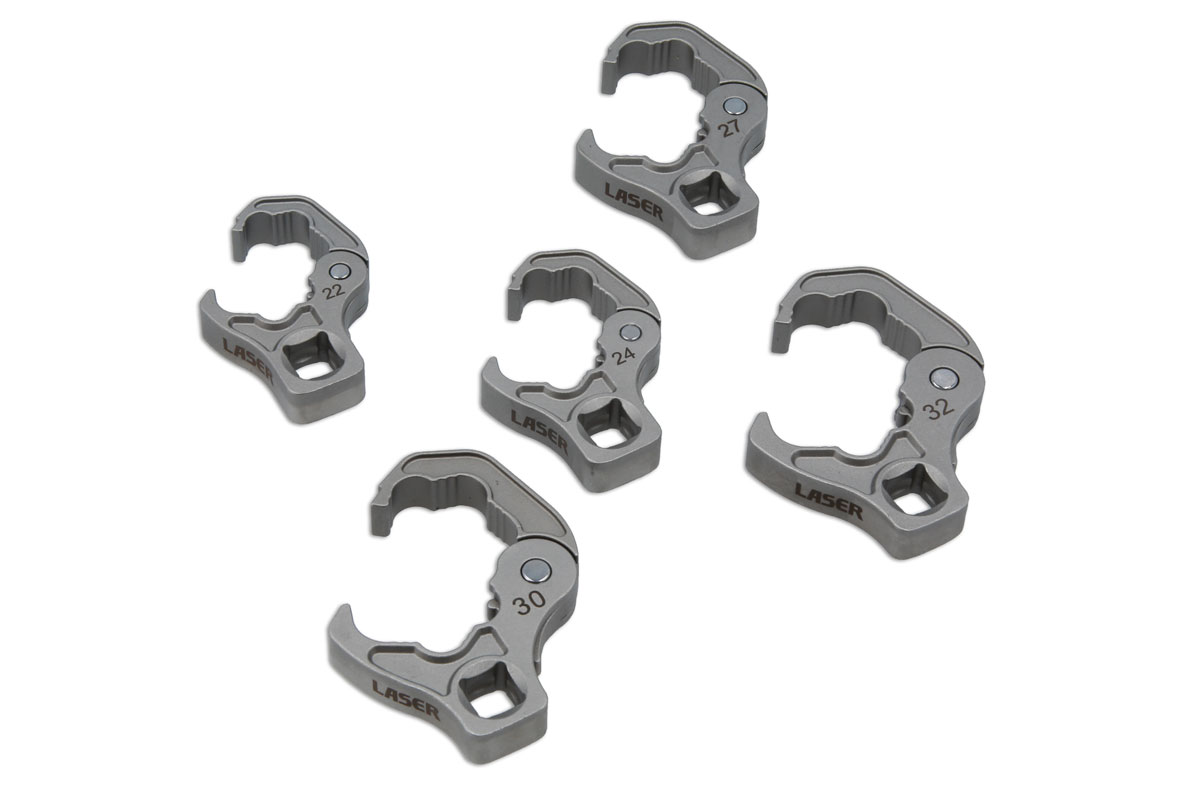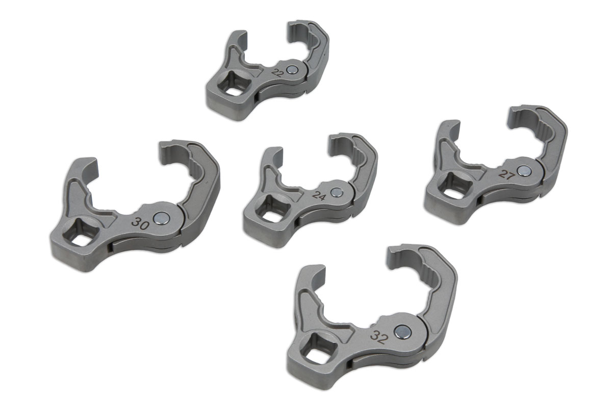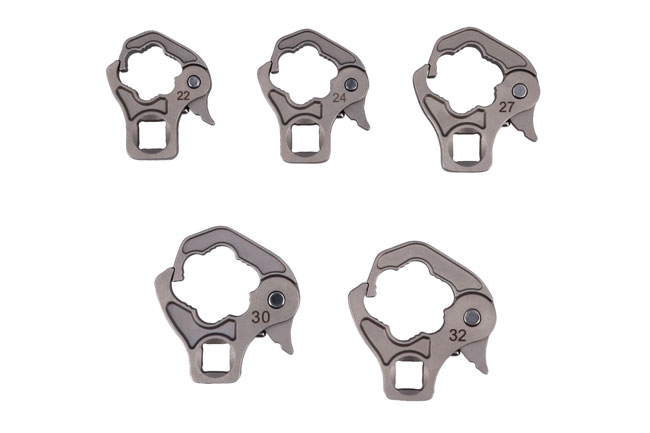 A set of five crows foot wrenches, in 22mm, 24mm, 27mm, 30mm and 32mm sizes, suitable for use on; track rod end fixings, large hexagon pipe and line fittings, hydraulic rams and wired sensors. Designed for use with a 1/2" square drive extension bar, they feature a spring-loaded quick snap design, allowing them to stay in the open position when placing around the fixing, together with a ratcheting action making them ideal for use in confined areas.