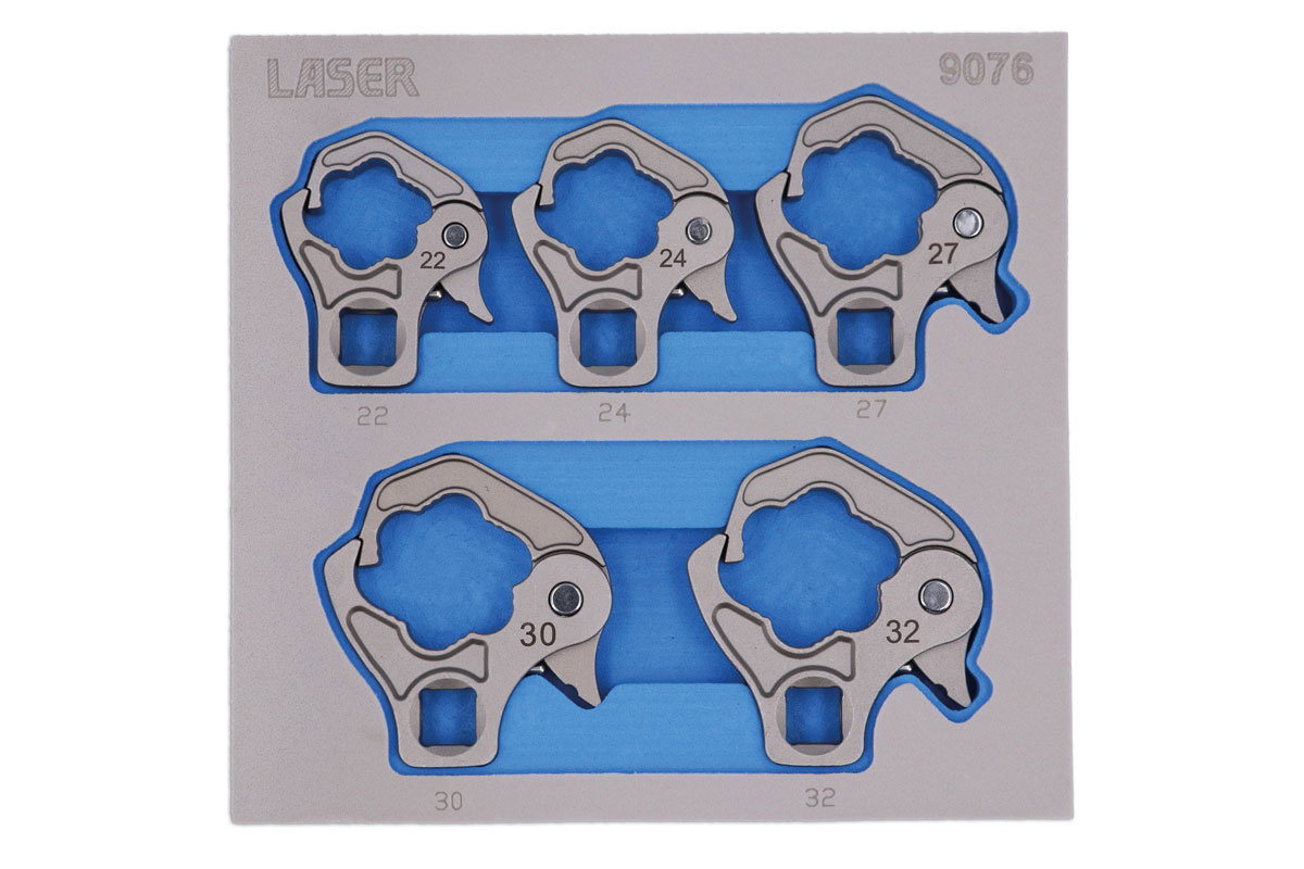 Een set van vijf kraaienpootmoersleutels, in de maten 22 mm, 24 mm, 27 mm, 30 mm en 32 mm, geschikt voor gebruik op; eindbevestigingen van spoorstangen, grote zeskantfittingen voor pijpen en leidingen, hydraulische plunjers en bedrade sensoren. Ze zijn ontworpen voor gebruik met een verlengstuk met 1/2"-vierkantaandrijving en hebben een veerbelast snelkoppelingsontwerp, waardoor ze in de open stand blijven staan wanneer ze rond de bevestiging worden geplaatst, samen met een ratelende werking waardoor ze ideaal zijn voor gebruik in kleine ruimten.
