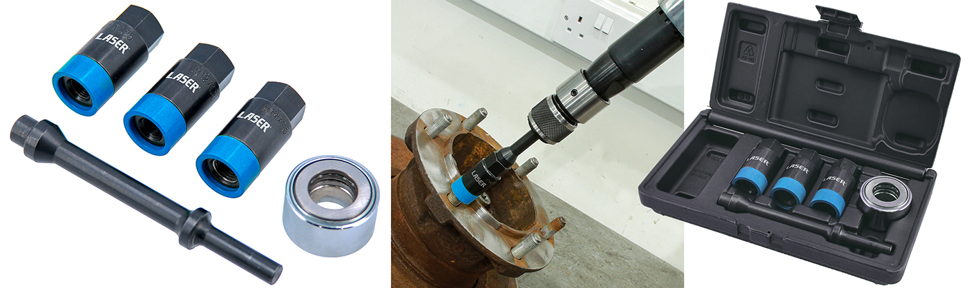 A simple and fast-to-use set of threaded sockets, extraction punch and fitting bearing. For extraction, simply part screw the relevant socket on and use the punch in a suitable air chisel to push the old stud out. For fitting, insert the new stud, place the bearing over the stud and use the appropriate socket to wind the stud into place.
