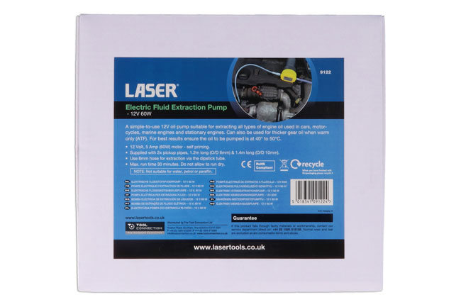 A simple-to-use 12V oil pump suitable for extracting all types of engine oil used in cars, motorcycles, marine engines and stationary engines. Can also be used for thinner gear oil when warm only (ATF). For best results ensure the oil to be pumped is at 40 to 50°C.