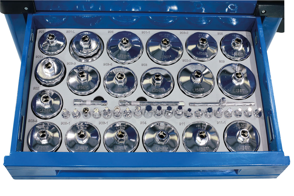 - Drei Schubladen für die Aufbewahrung von Ölservice-Werkzeugen. Geliefert mit einem 58-teiligen Ölfilterschlüssel- und Ablassstopfen-Schlüsselsatz, Laser Teile-Nr. 9128.