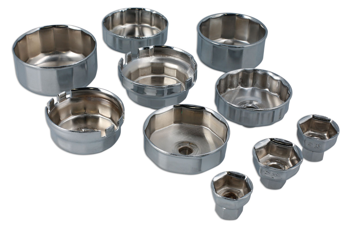 A comprehensive 58-piece oil filter wrench set made up of 32 cup style wrenches and 20 drain plug sockets. Includes adjustable oil filter grip wrenches. The Laser 9128 offers the perfect oil service tool set covering European, Far Eastern and American vehicles as listed.