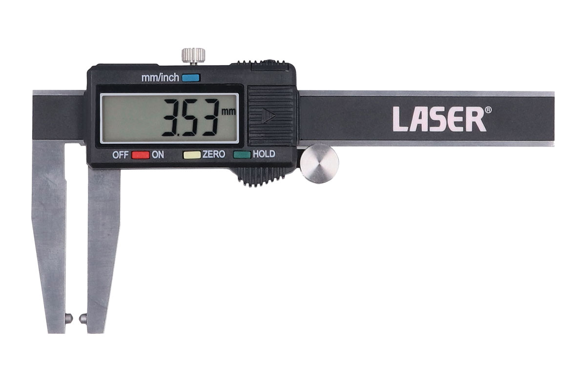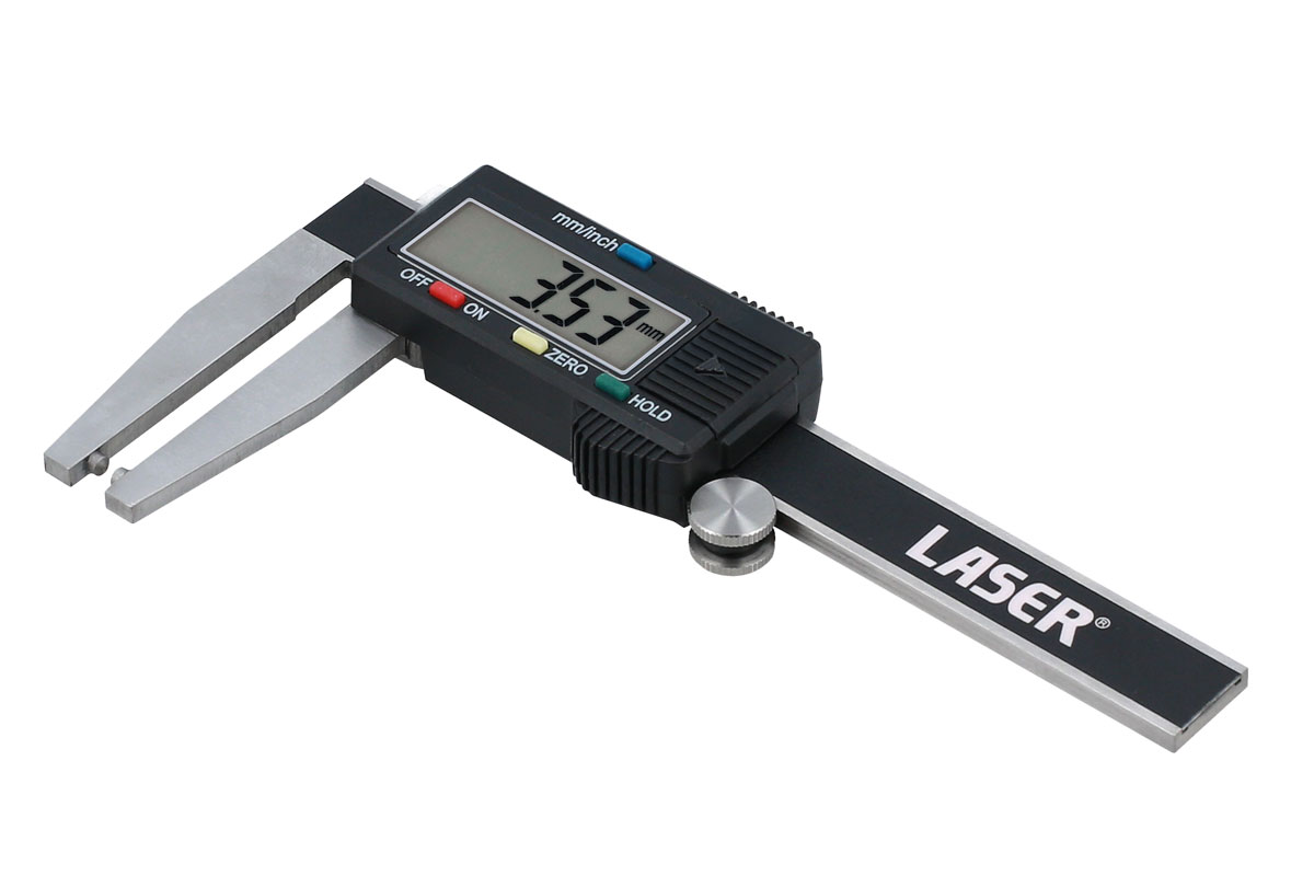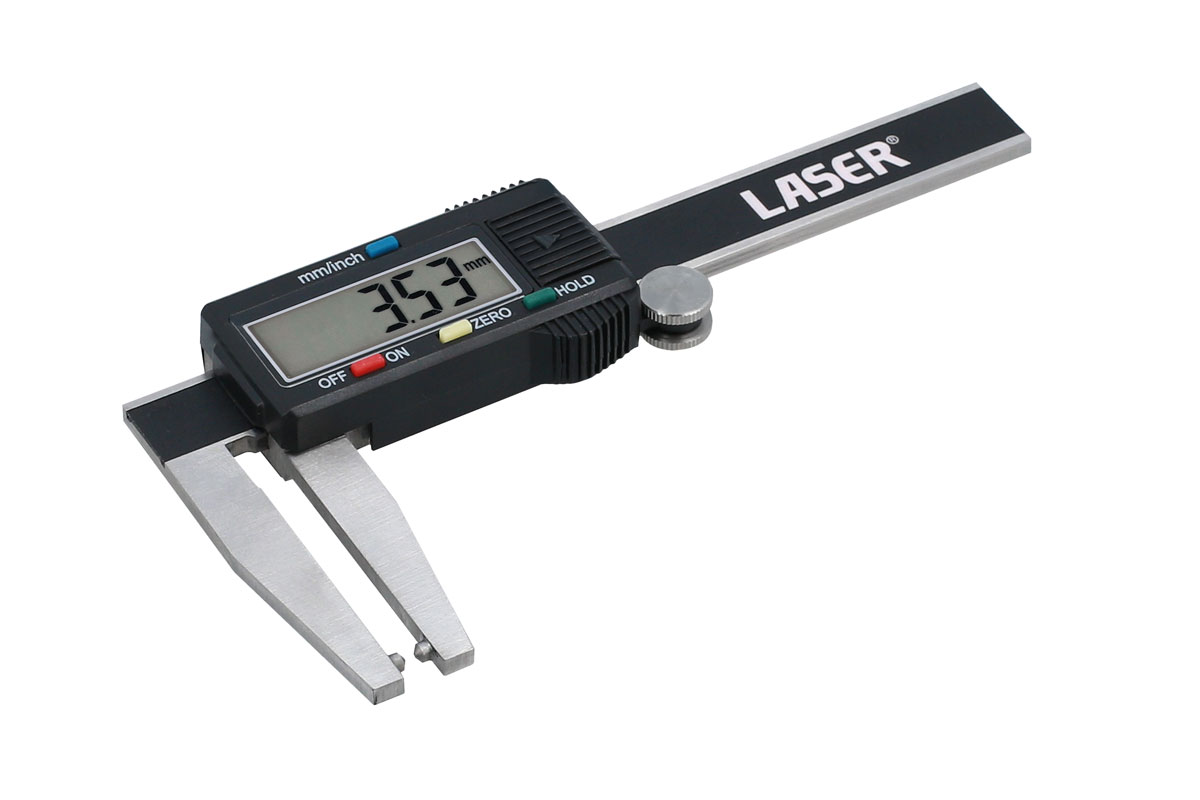 A digital vernier gauge with a data hold function, suitable for measuring brake disc thickness. Features an LCD screen, which can display the measurement in either metric or imperial, with the caliper jaws designed to allow them to fit over any wear lip or corroded edge running around the outside of the disc, allowing for an accurate measurement to be taken from the braking surface. Ideal for use as part of a vehicle service or safety inspection.