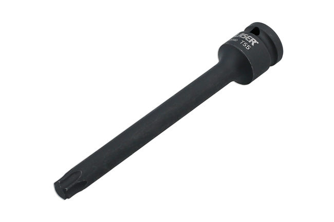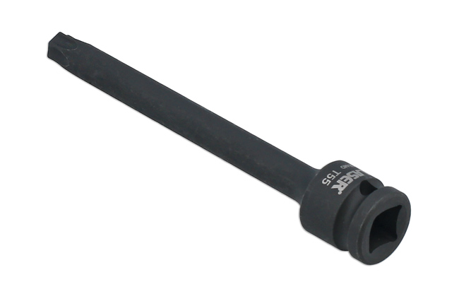 A long series impact quality, T55 Star* 1/2"D bit socket for use on Ford Transit twin wheel front brake disc retaining bolts. It features a one-piece construction and manufactured from chrome molybdenum for impact strength with anti-corrosion black phosphate finish, together with a groove and holes for use with a retaining ring and pin.