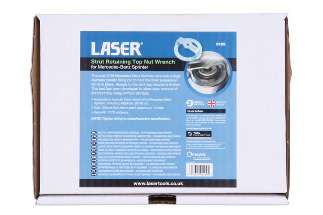 Mercedes-Benz Sprinter ab Baujahr 2018 verwenden eine Kunststoff-Befestigungsmutter mit großem Durchmesser, die das Federbein der Vorderradaufhängung in Position hält. Der Zugang zu den oberen Federbeinaufnahmen ist eingeschränkt. Das Werkzeug Laser 9169 wurde entwickelt, um einen einfachen und beschädigungsfreien Ausbau dieses Befestigungselements zu ermöglichen.