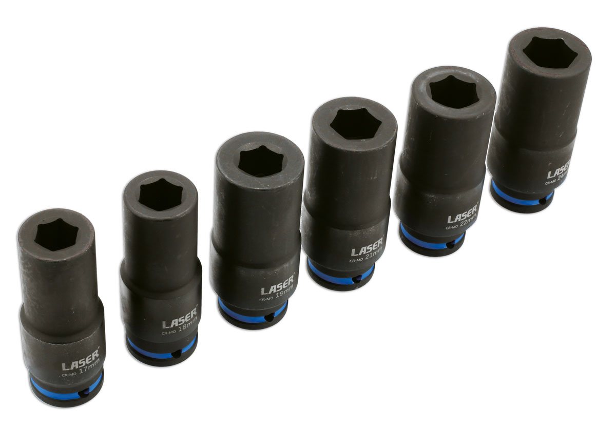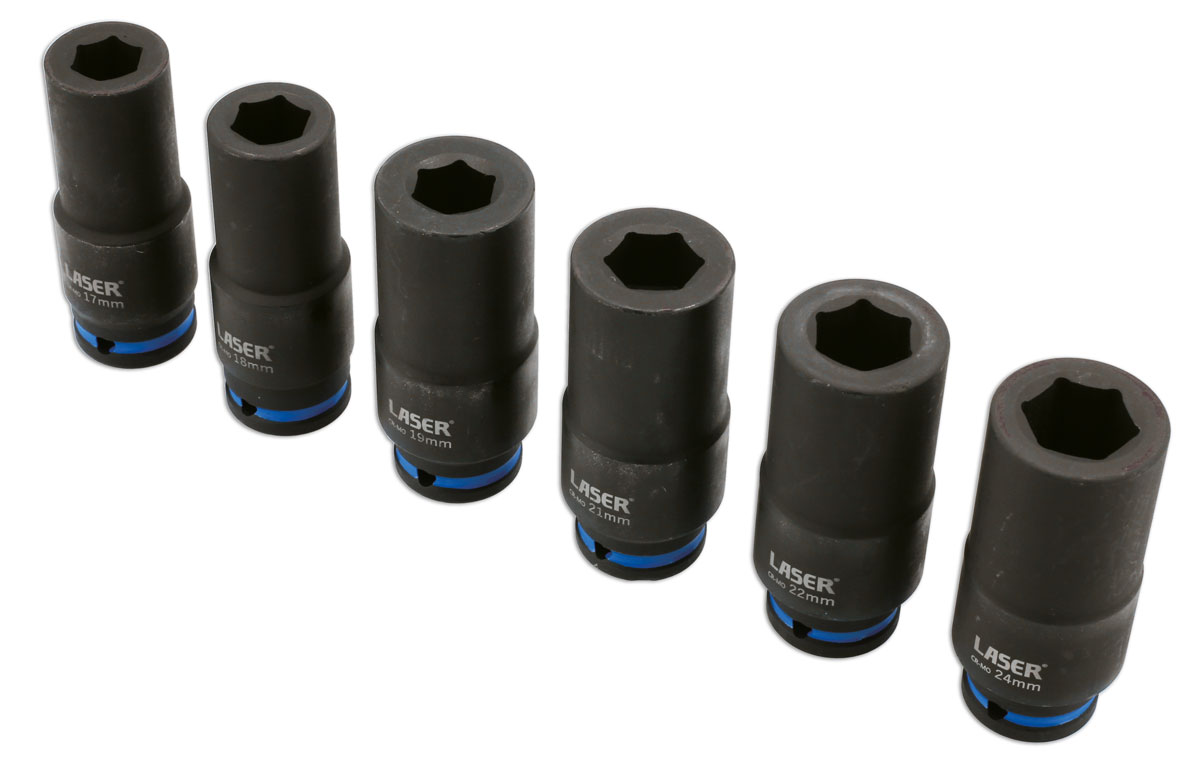 In response to requests from customers, Laser Tools have expanded on the range of weighted sockets. The Laser 9172 6 pc socket set features six 1/2"D sockets all sized to better suit the UK and European car parc. The increased weight designed into these sockets reduces impact losses, increasing the effective torque delivered by the impact gun.