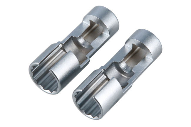A set of 2 specially dimensioned Bi-hex injector pipe gland nut sockets. The sockets outer dimensions have been significantly reduced to ensure you can easily make full contact with the 17mm and 18mm pipe nuts found used on Piezo style injectors with top mounted pipes.