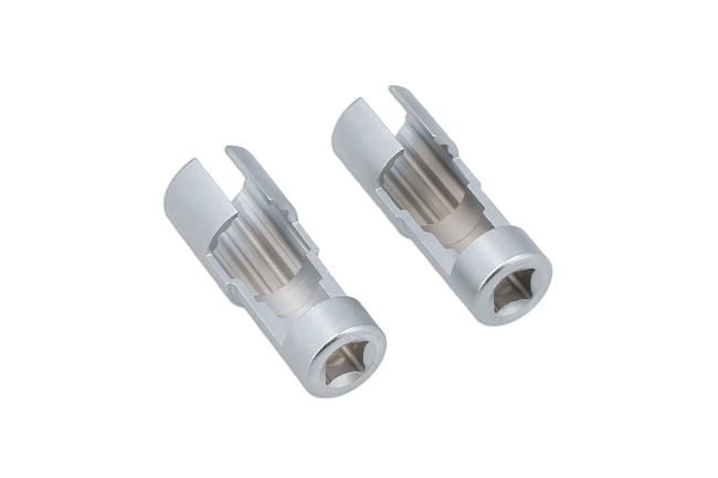 Ein Satz von zwei speziell dimensionierten Doppelsechskant-Steckschlüsseleinsätzen für Einspritzrohr-Verschraubungsmuttern. Der Außendurchmesser der Einsätze wurden erheblich verringert, um einen einfachen und vollständigen Kontakt mit den 17-mm- und 18-mm-Rohrverschraubungen an Piezo-Einspritzdüsen mit obenliegenden Leitungen zu gewährleisten.