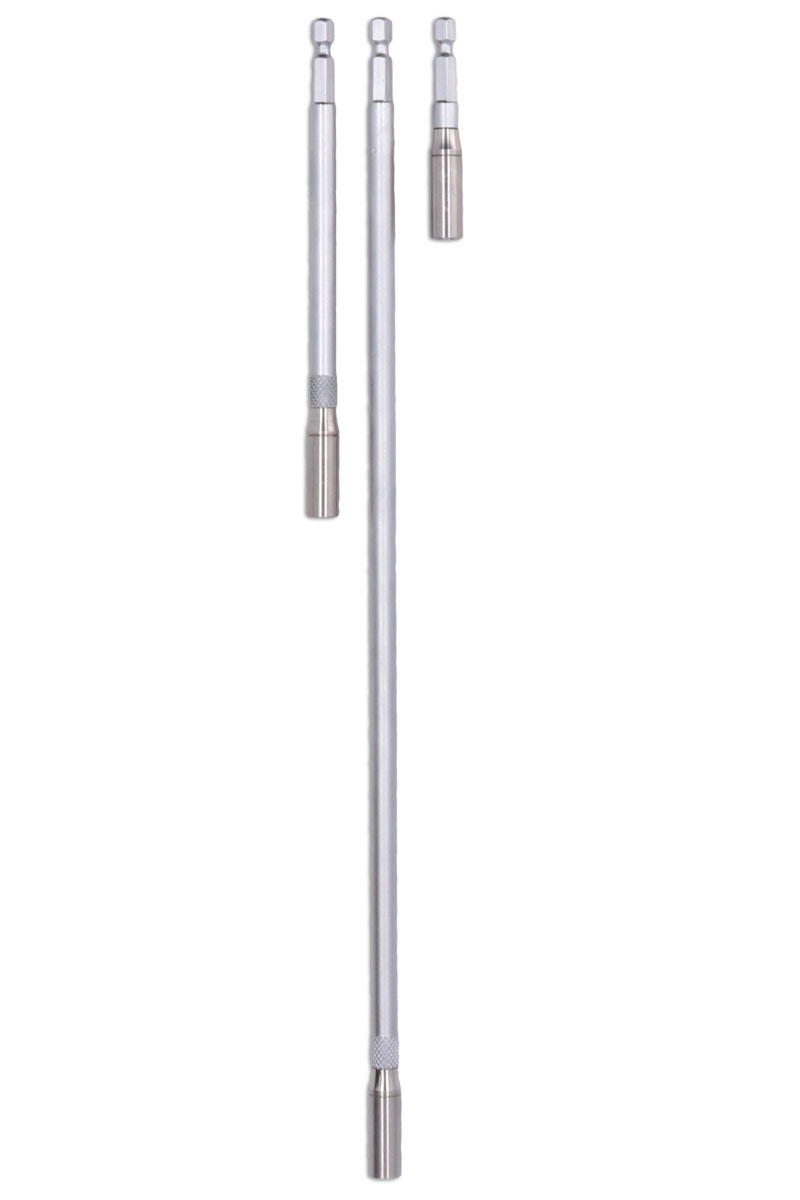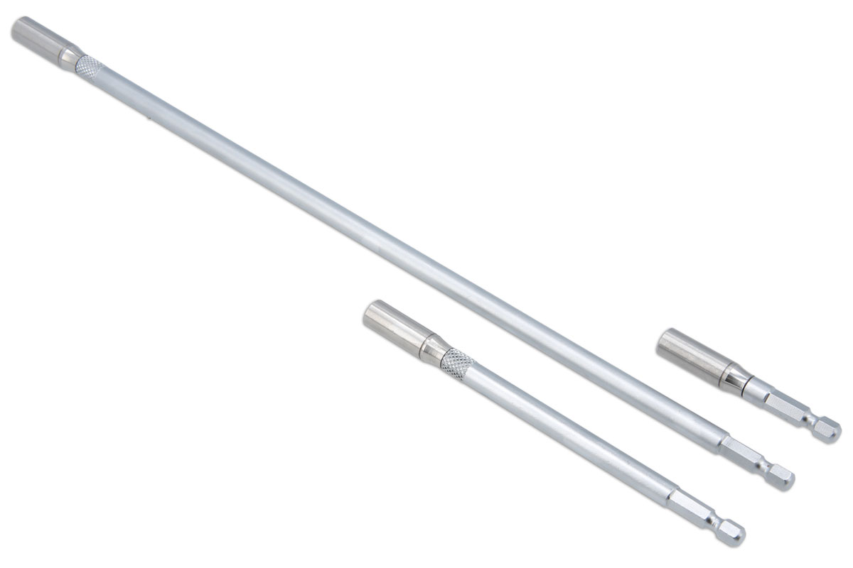 Jeu de 3 rallonges magnétiques pour porte-embouts, chacune équipée d'un mandrin rapide, convenant à la fois aux perceuses et aux visseuses sans fil. Porte-embouts en acier inoxydable soudés à des tiges en chrome vanadium pour plus de solidité. Kit d'accompagnement idéal pour tous les jeux d'embouts hexagonaux 1/4".