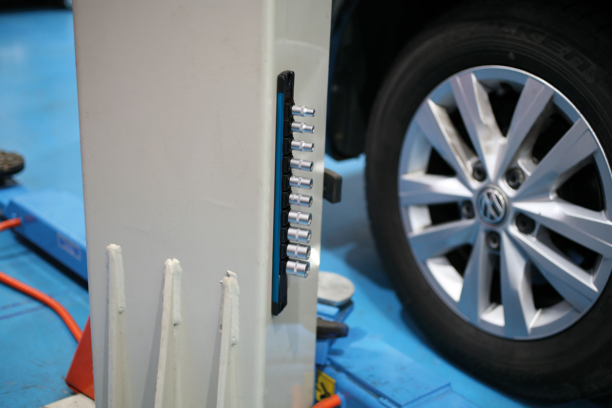 A new patented socket storage rail which allows sockets to be quickly and easily locked and unlocked. Designed to prevent the sockets from falling off when the rail is being removed from the tool chest for use. The rail features two strong Neodymium Iron Boron (NdFeB rare earth) magnets to ensure it stays attached to the toolbox drawer base or the outside of the toolbox, even when full of sockets. Soft backing cover ensures damage free use. Also equipped with mounting holes for permanent attachment to non-ferrous surfaces. Can be used for vertical storage on shadow boards etc.