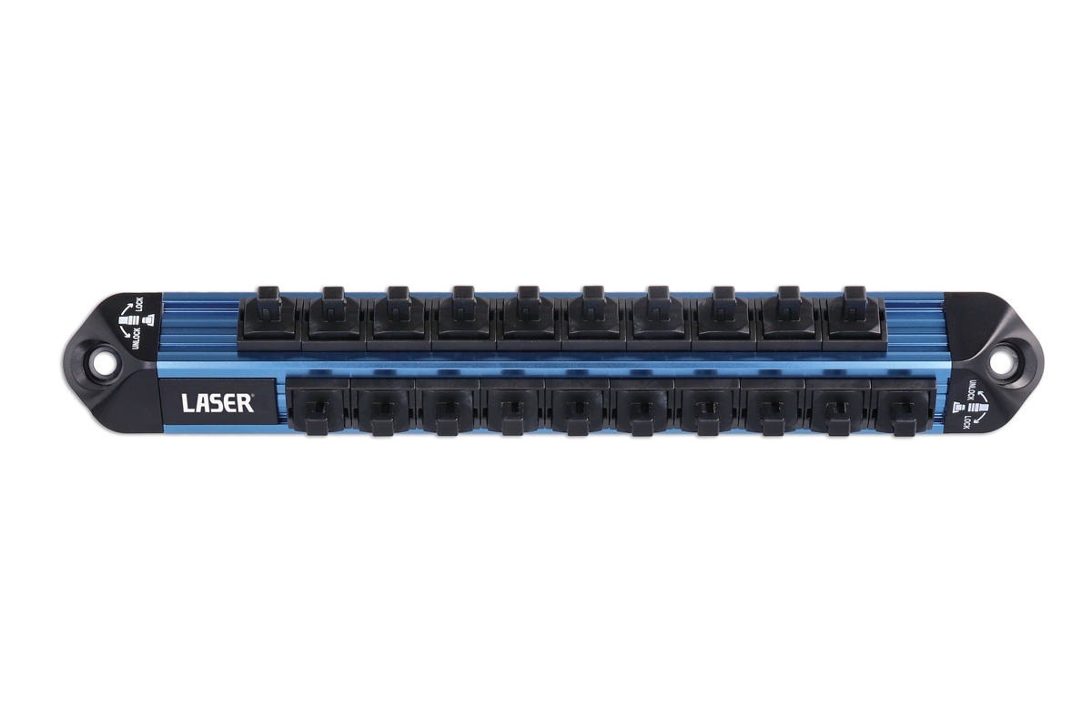 - Steckschlüsseleinsatz-Schienen für Stecknüsse mit 3/8"-Antrieb und 1/2"-Antrieb ebenfalls erhältlich, siehe Laser Teile-Nr. 9240 (3/8"-Antrieb) und 9241 (1/2"-Antrieb).