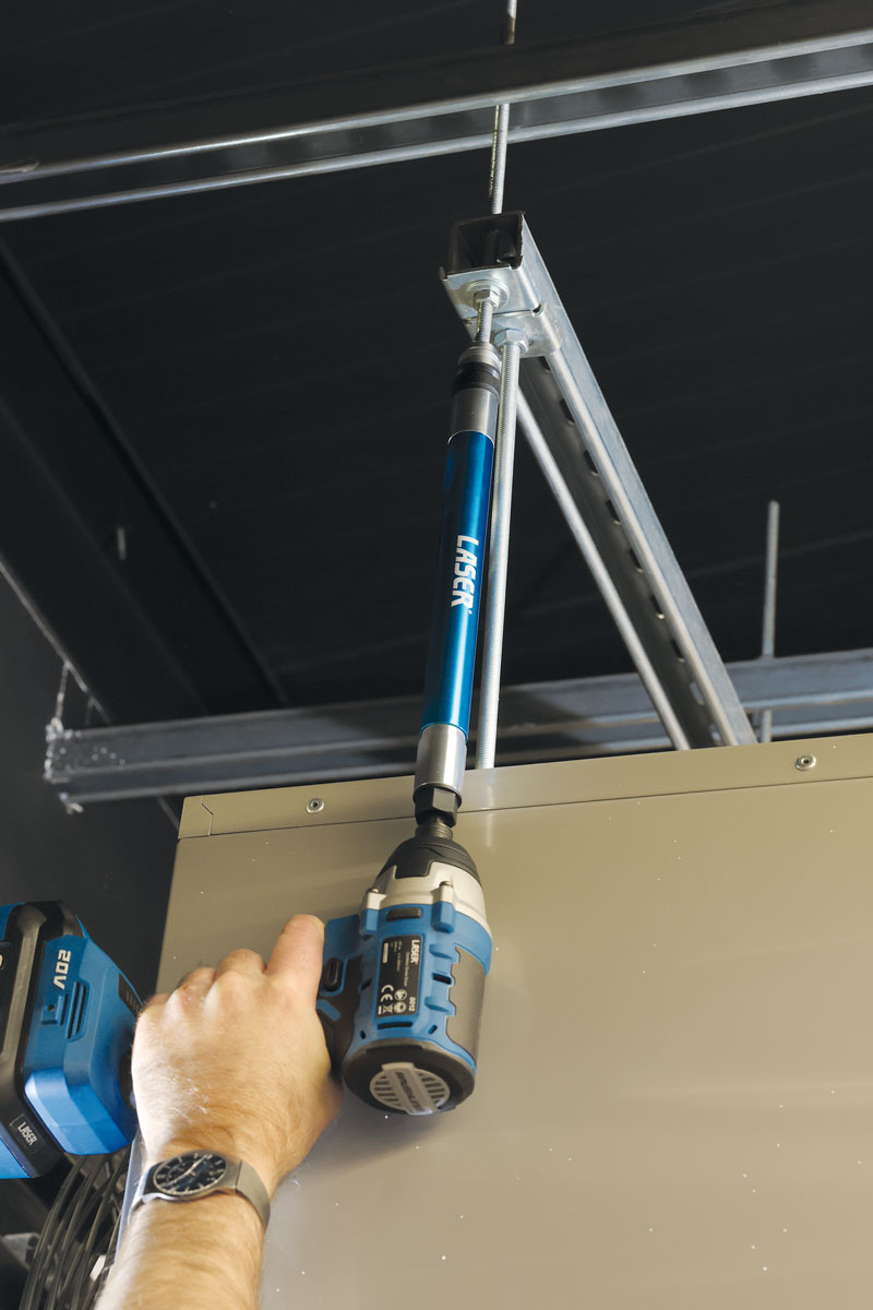 Conçu pour être utilisé avec n'importe quelle perceuse-visseuse sans fil à embout hexagonal de 1/4", ce kit comprend un tube de 315 mm de long et un jeu de douilles à 6 pans de type traversant avec un hexagone externe de 14 mm. Les douilles se montent sur le tube d'entraînement, ce qui permet de faire passer les écrous le long des goujons et des boulons à filetage long. Le dispositif d'entraînement comprend un cran d'arrêt et un ressort de maintien, afin d'empêcher l'écrou de tomber lors d'une utilisation verticale ; un manchon rotatif, qui permet de le positionner et de le maintenir en place pendant l'utilisation ; et un mandrin à serrage rapide.
