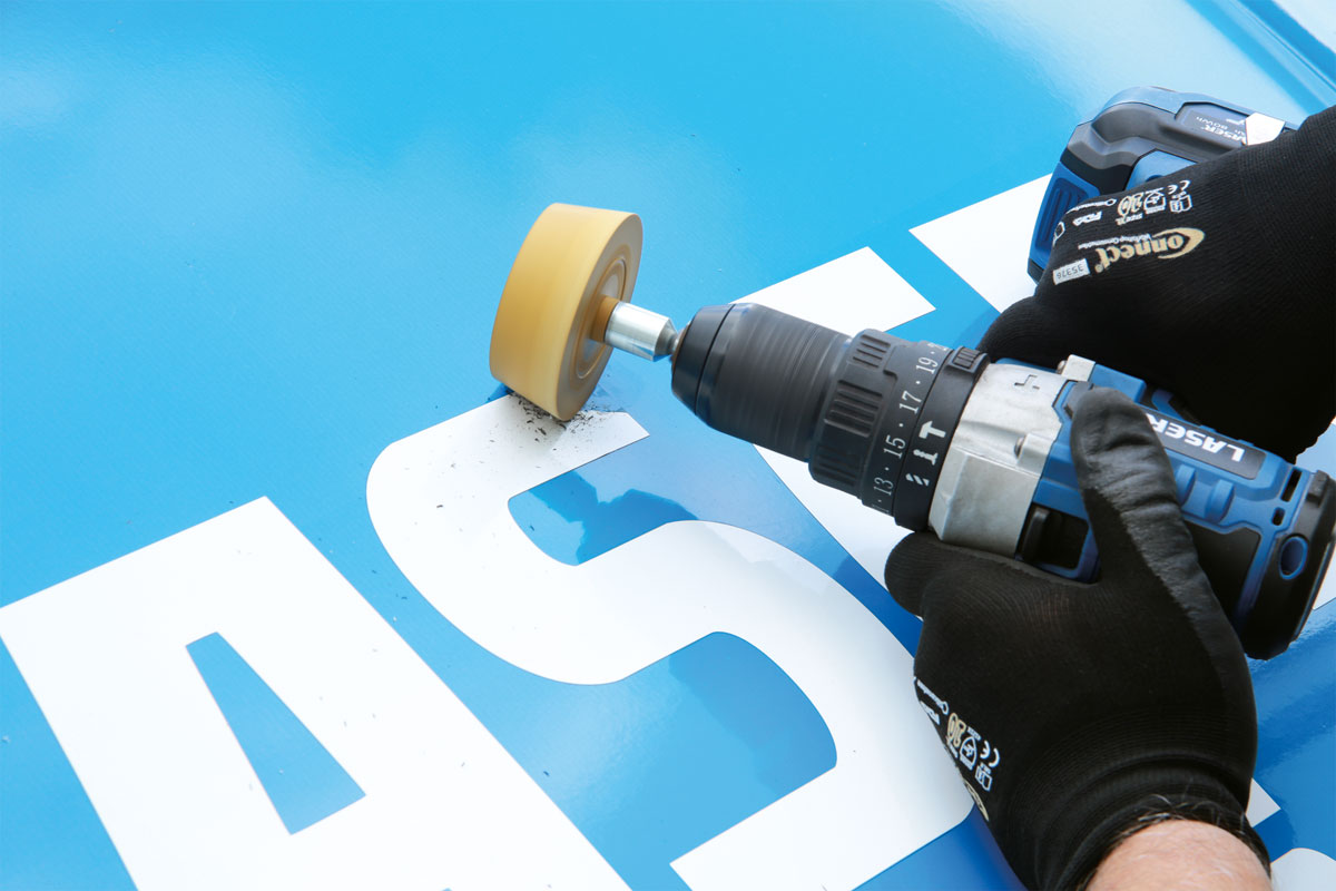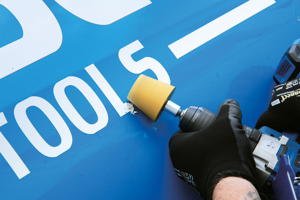 Ein Satz von zwei kegelförmigen Radierscheiben zum Entfernen von Zierstreifen, Abziehbildern, Aufklebern, Klebeband und Rückständen von der Karosserie, ohne die Oberfläche zu beschädigen. Die Kegelform ist besonders bei der Bearbeitung von Felgeninnenseiten nützlich. Kann auch auf Glas, Metall und Holz verwendet werden.