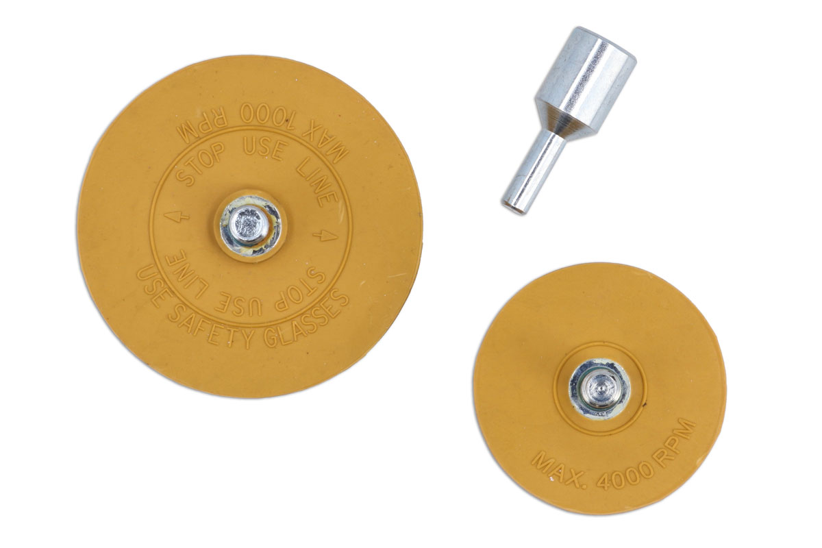 A set of two cone shaped stripe off discs for removing pinstriping, decals, stickers, adhesive tape, and residue from car bodywork without damaging the surface. The cone shape is especially useful when working on inner wheel rims. Can also be suitable for use on glass, metal, and wood.