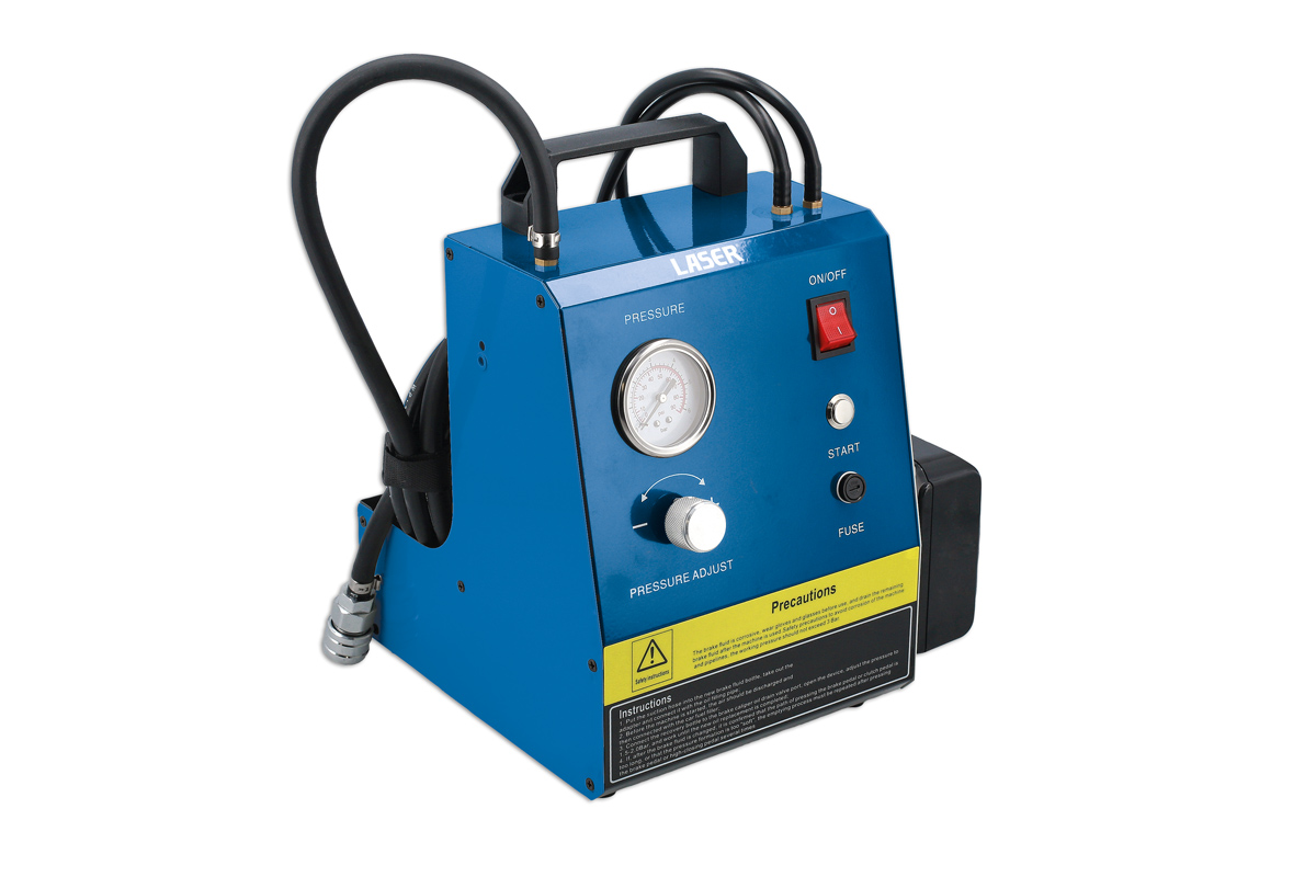 The Laser Tools 9315 pressure bleeder kit offers complete portability with multiple power options: mains, 12V, or its own detachable 21V rechargeable battery. The kit includes 16 precision-machined aluminium brake bleed adaptors and is also compatible with Laser Tools' existing range of brake bleed caps.