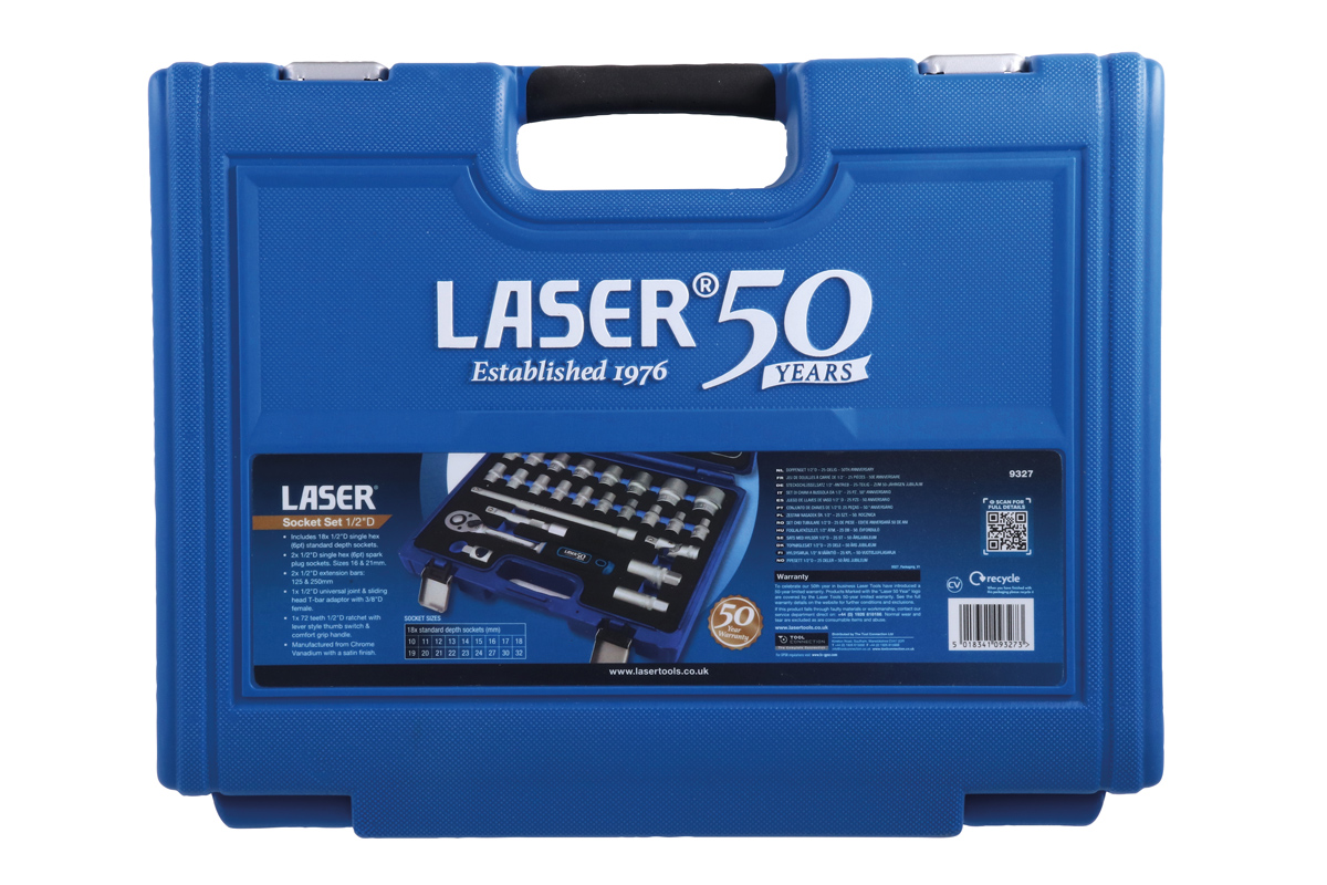 A 25-piece Chrome Vanadium socket set with a hard-wearing, functional satin chrome finish, the Laser 9325 1/2" drive set is supplied in an easy-to-store, impact-resistant case, designed to last 50 years or more. Chrome Vanadium steel offers exceptional strength, durability and resistance to corrosion, making it ideal for demanding tasks and environments. The added chromium protects against rust, while the vanadium enhances toughness and wear resistance. Launched to celebrate Laser Tools 50th year and covered by the Laser Tools special 50-year limited warranty (see website for details).