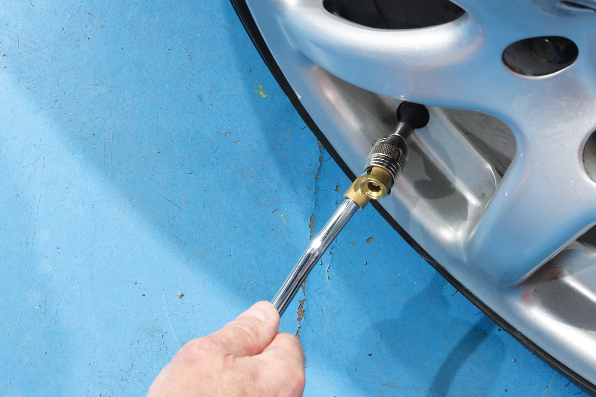 A twin-head tyre valve connector, with closed end type connector. The unit has a built-in non-return valve that unseats to allow air flow only when securely attached to a tyre's valve stem, preventing air loss when not connected.